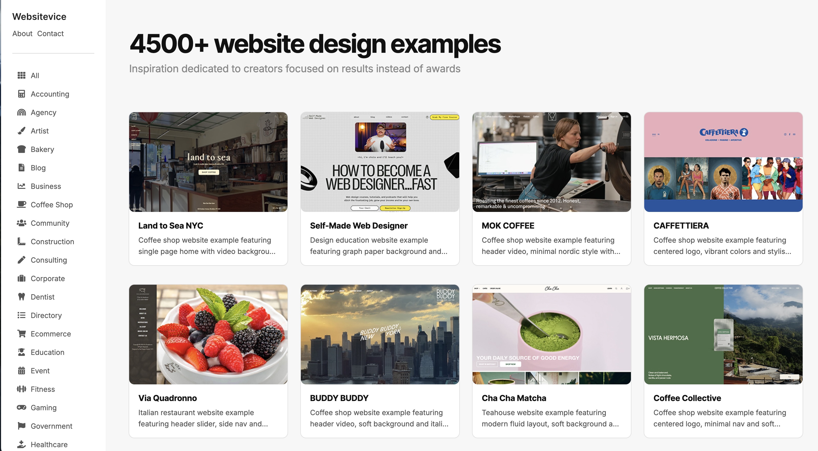 A unique and time-saving feature of Best Website Gallery is the display of multiple screenshots from each featured website. Instead of clicking through to a live website and navigating to different pages, you can view a snapshot of many different pages at once, all laid out on a single page. For me, this is a huge plus because sometimes I'm looking for web design inspiration for inner website pages (like About, Shop, or Services). Most of the other websites on this list only showcase the homepage design.